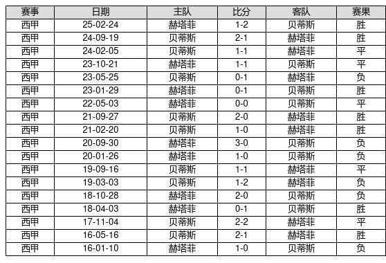 贝蒂斯 VS 赫塔菲两队近10年的交战次数为18场,贝蒂斯7胜5平6负,赢球概率为38.9%,平局概率为27.8%,输球概率为33.3%。