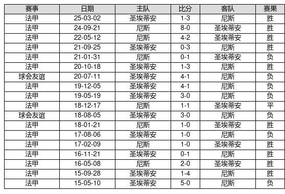 尼斯 VS 圣埃蒂安两队近10年的交战次数为18场,尼斯10胜1平7负,赢球概率为55.6%,平局概率为5.6%,输球概率为38.9%。