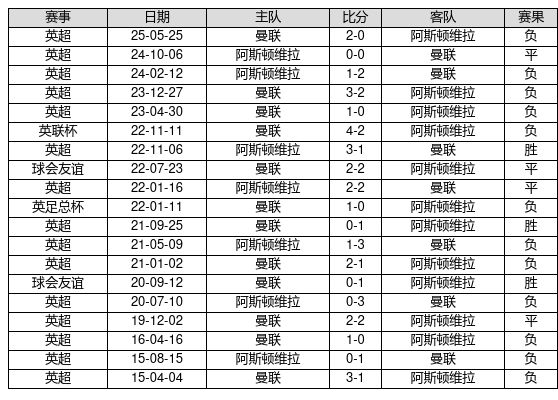 阿斯顿维拉 VS 曼联两队近10年的交战次数为19场,阿斯顿维拉3胜4平12负,赢球概率为15.8%,平局概率为21.1%,输球概率为63.2%。
