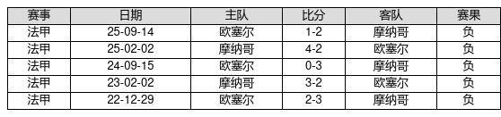 欧塞尔 VS 摩纳哥两队近10年的交战次数为5场,欧塞尔0胜0平5负,赢球概率为0.0%,平局概率为0.0%,输球概率为100.0%。